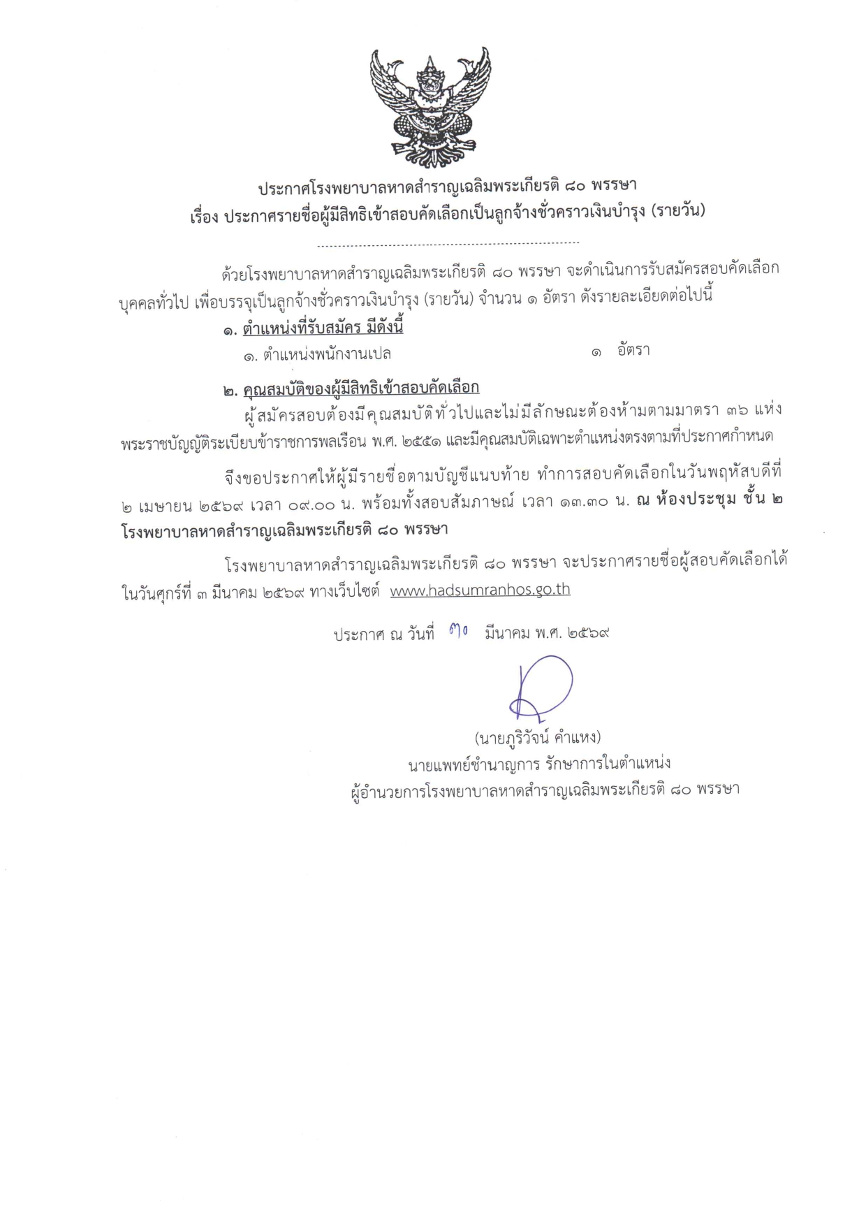 17 MAR ประกาศรับสมัครสอบคัดเลือกเพื่อบรรจุบุคคลทั่วไปเป็นลูกจ้างชั่วคราวเงินบำรุง(รายวัน) โรงพยาบาลหาดสำราญฯ ...